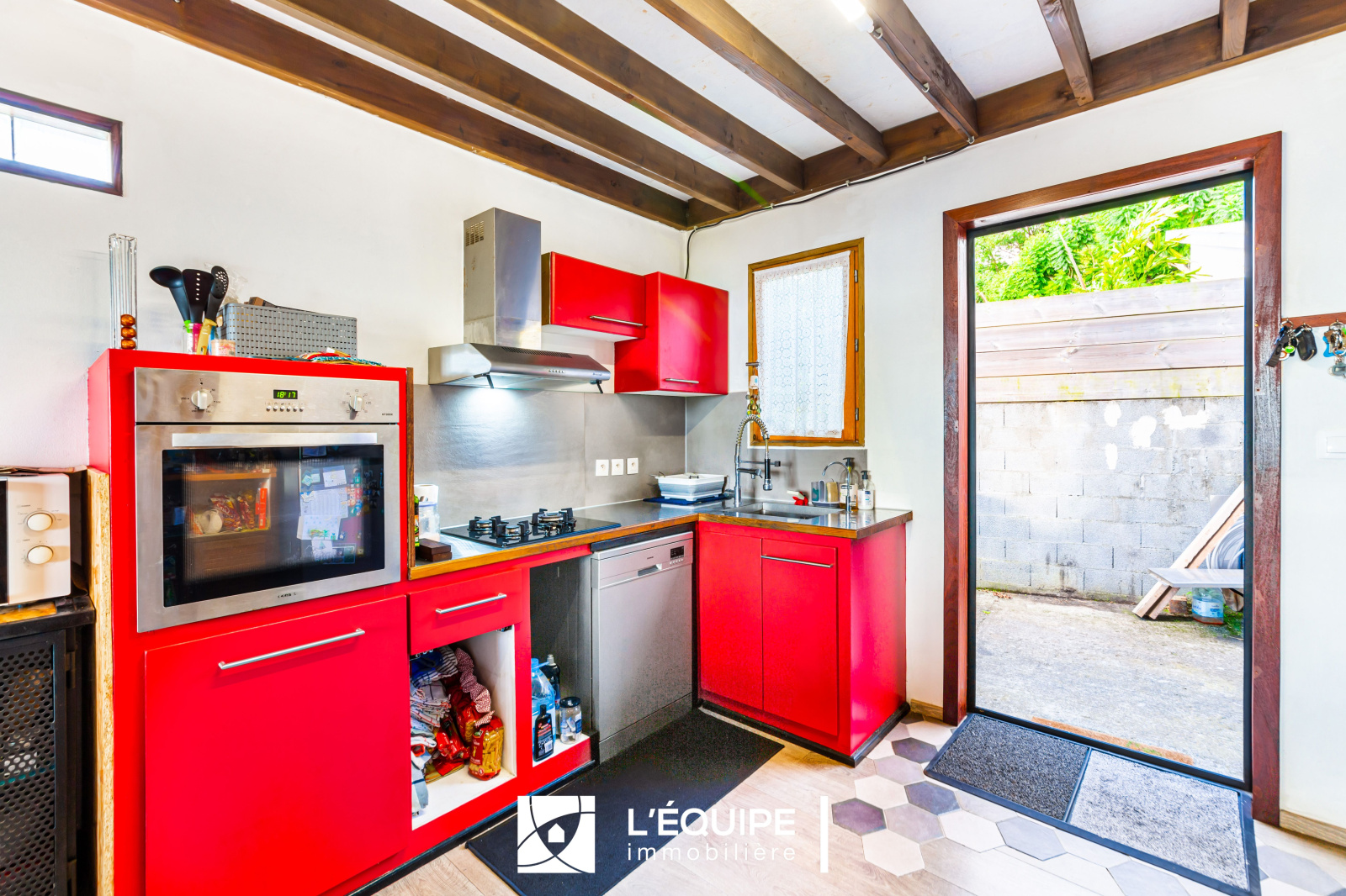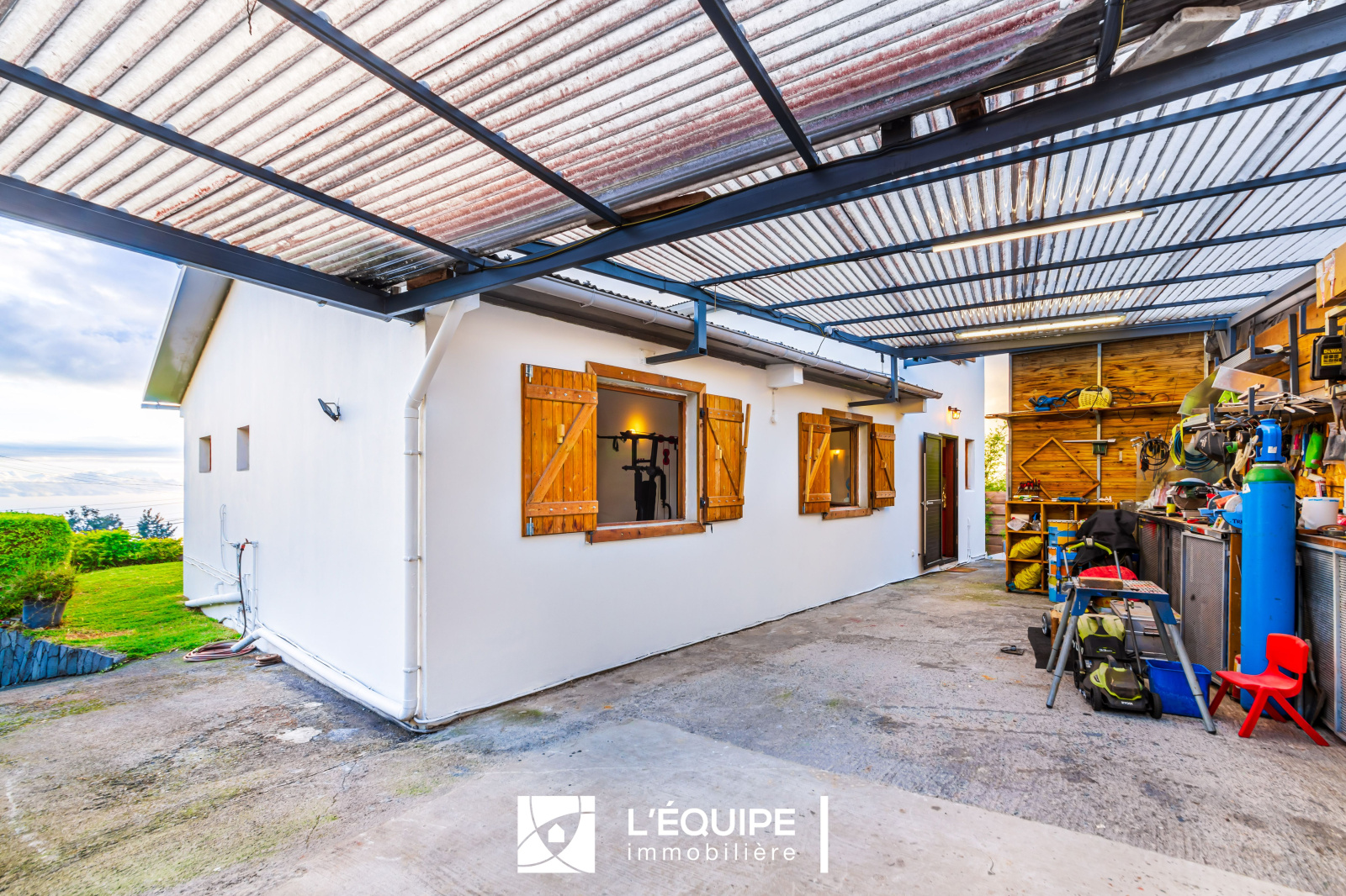 Un abri voiture, une terrasse ouverte sur le jardin.