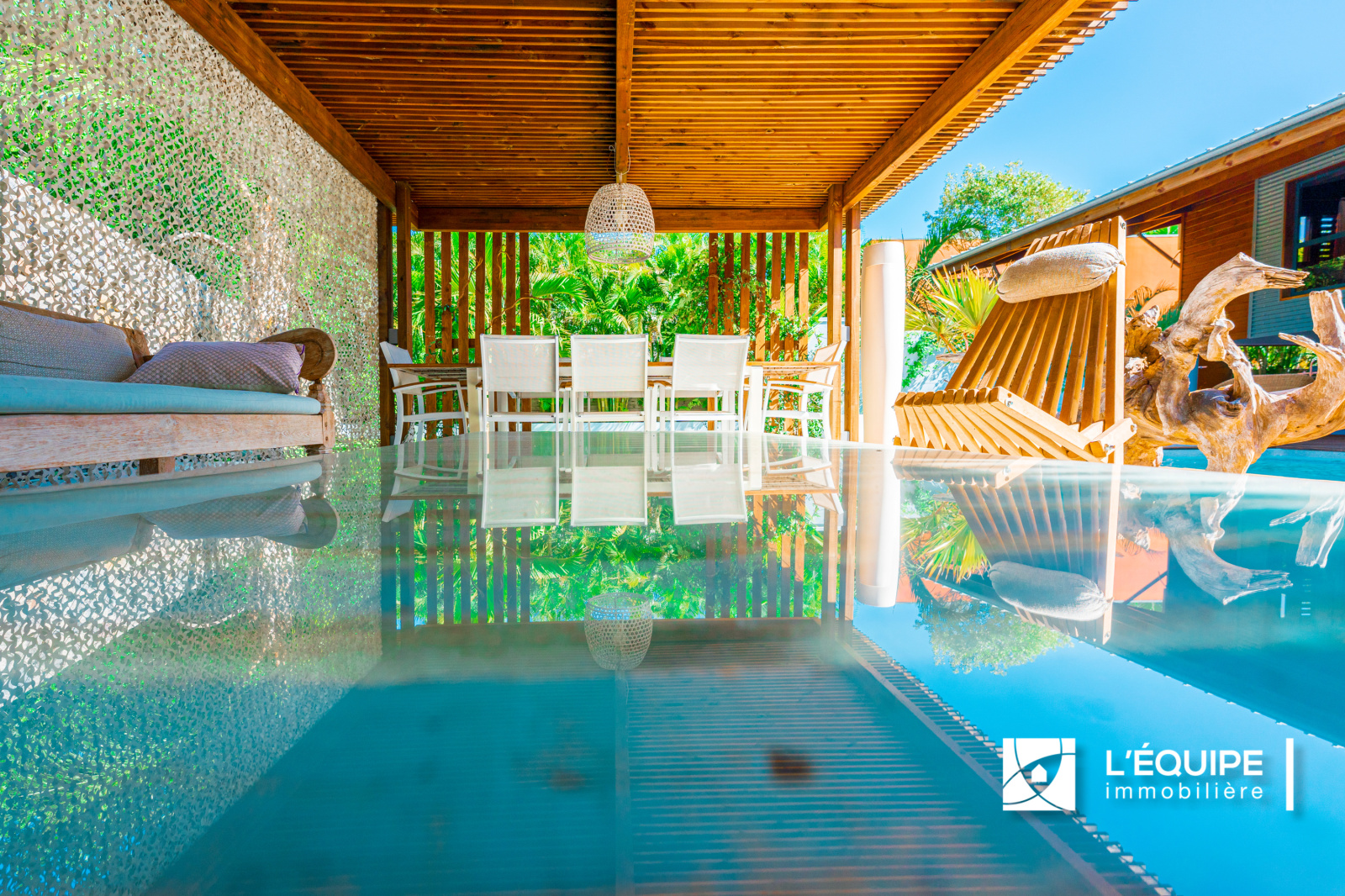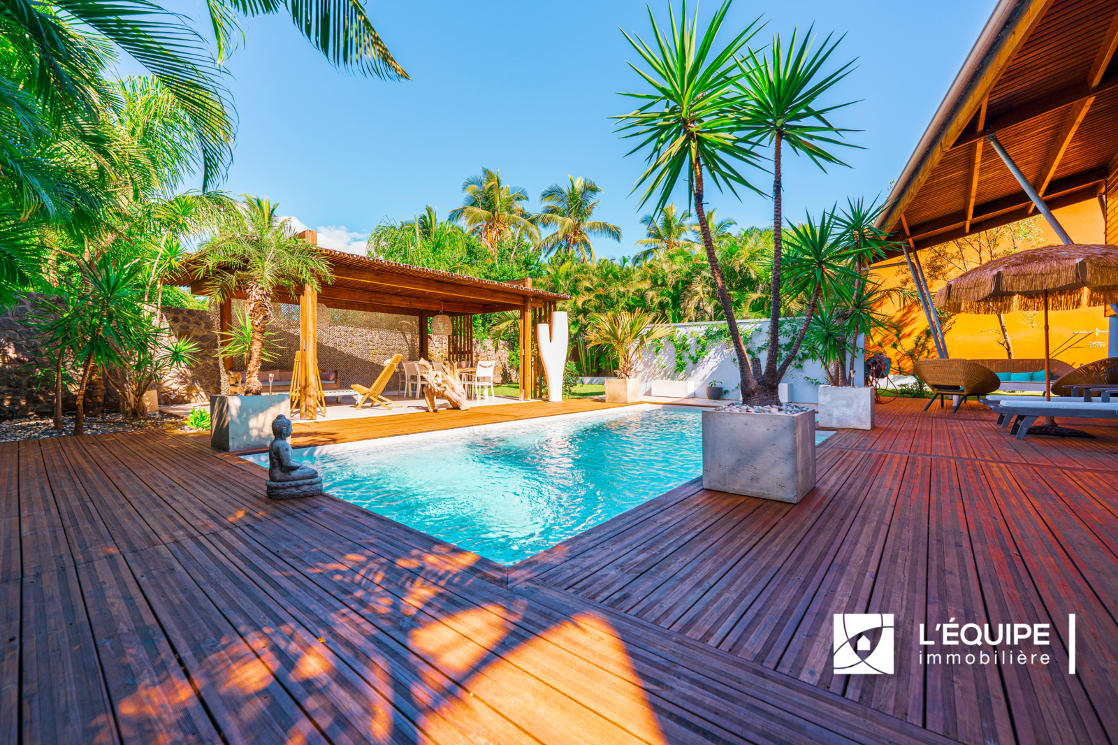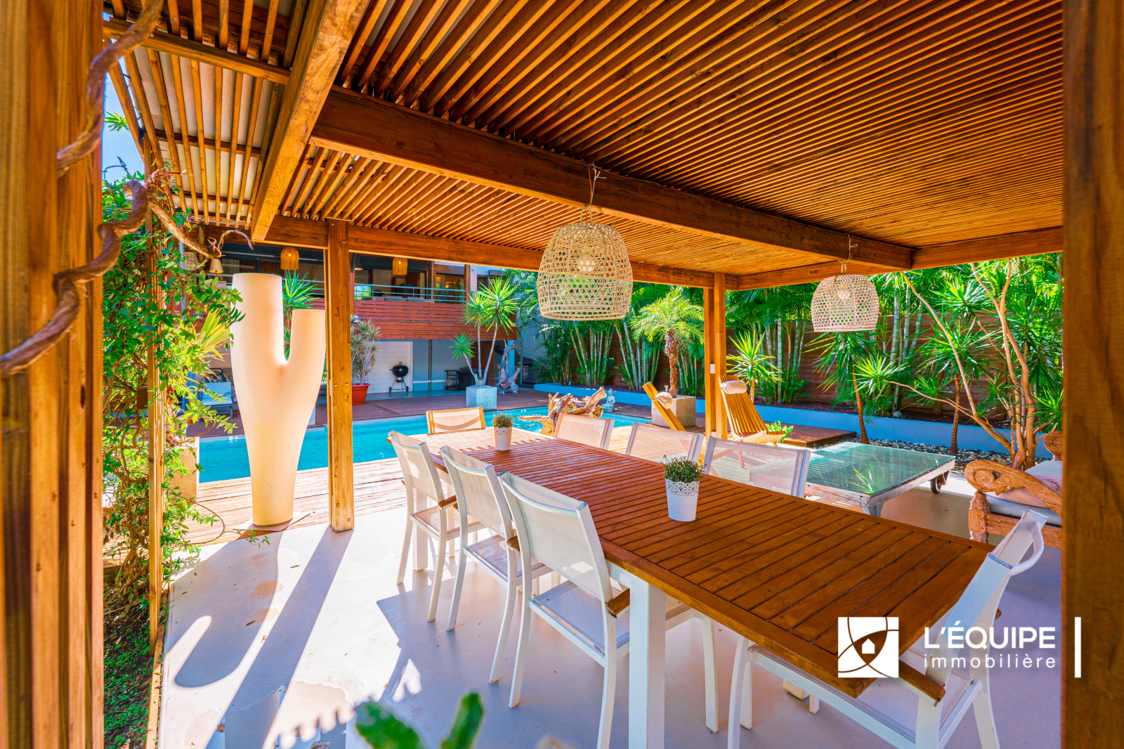 EXCEPTIONNEL, rare sur le secteur de l'Etang Saint Paul, l'Equipe Immobilière vous propose à la vente cette somptueuse villa de 185 m2 hab sur un terrain de 699 m2 avec piscine. Tout confort, ces nombreuses prestations vous séduiront. Dans un lotissement fermé et sécurisé à 2 pas de la Cocoteraie vous y trouverez principalement dans cette maison au style balinais, un séjour cuisine de 56 m2, 3 chambres, un bureau, un studio indépendant au rez-de- jardin, un garage, plusieurs varangues.