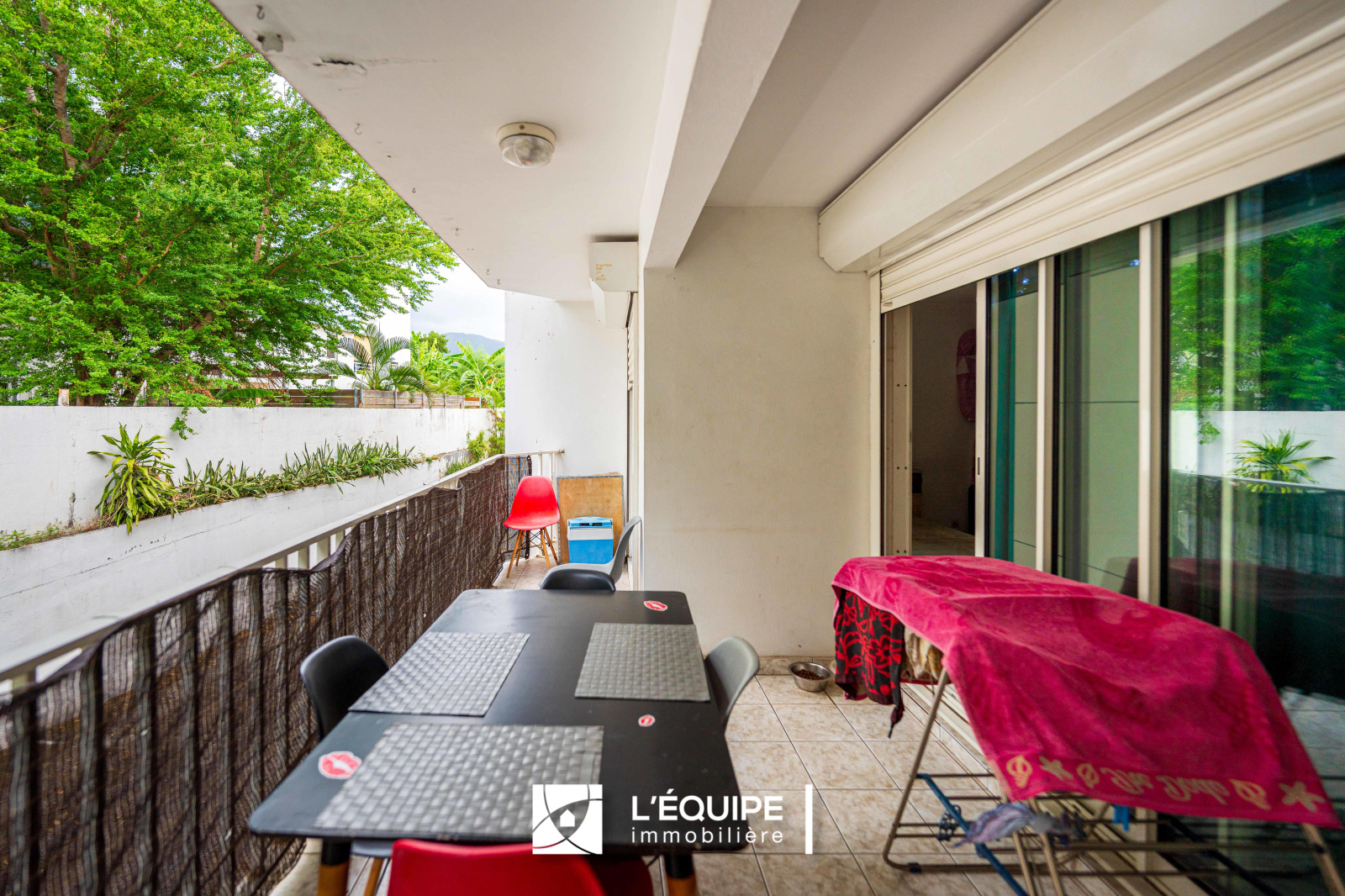 La varangue, équipée de volets roulants électriques, offre un bel espace de vie extérieur calme à l’arrière du bâtiment.