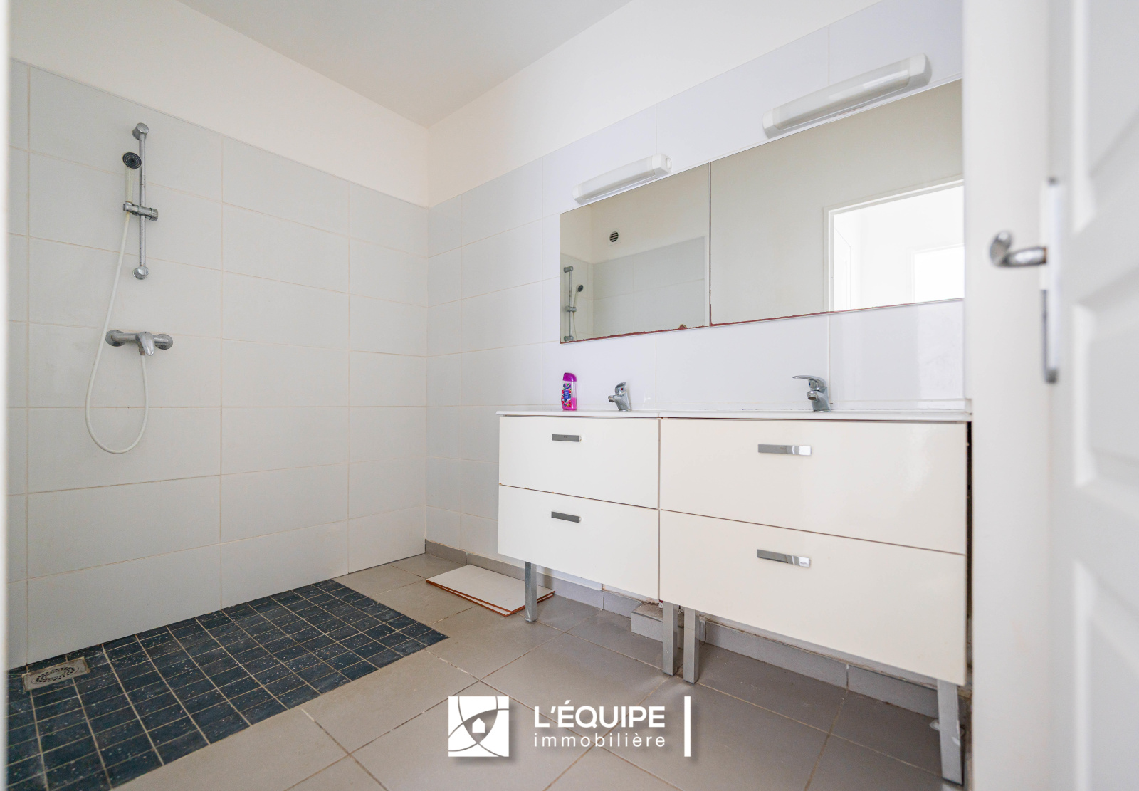 La salle de douche, moderne, offre une surface confortable avec une douche à l'italienne, deux vasques sur meuble avec miroir.